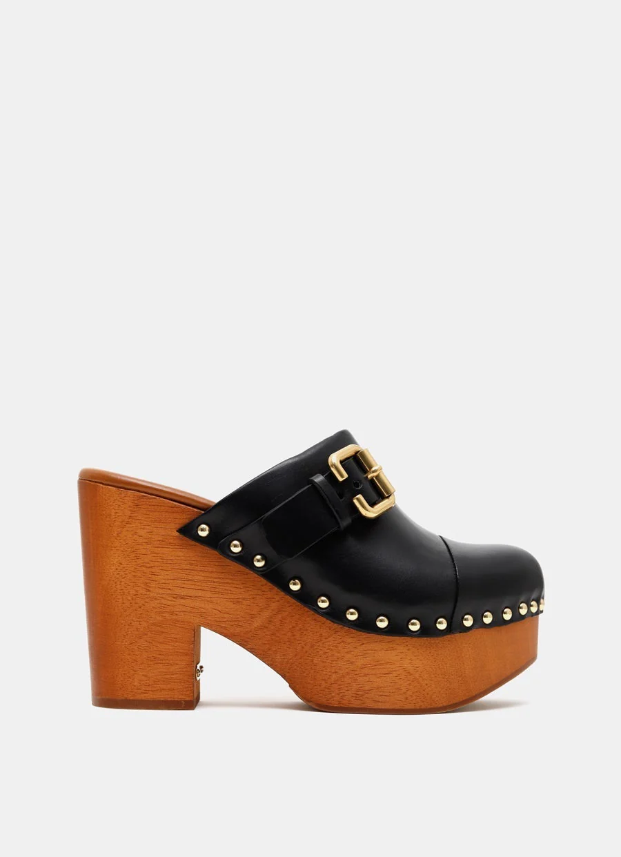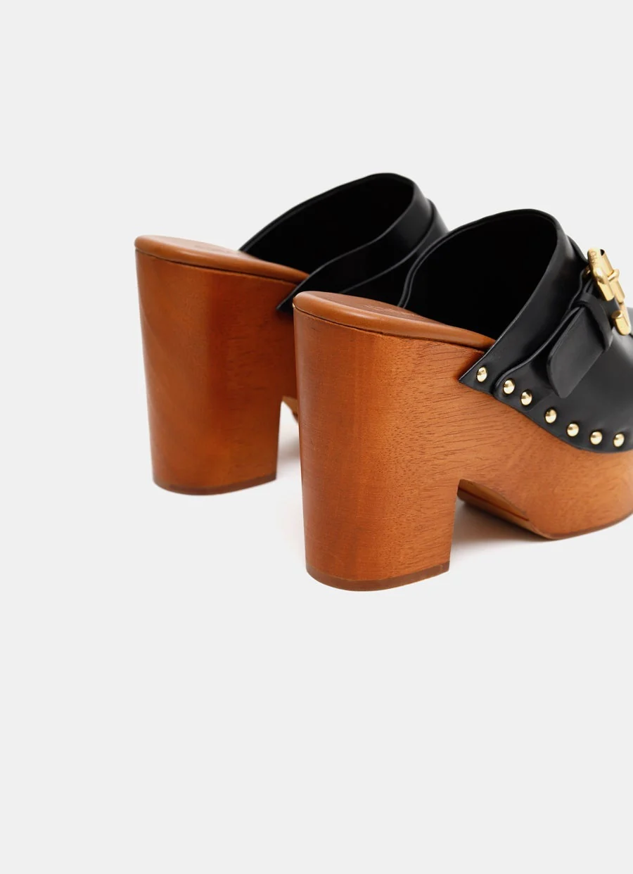 Zuecos de Chloé con plataforma de madera con tacón grueso, pala de cuero de vaca brillante. Detalle de tachuelas doradas, hebilla metálica, y placa con logo. Tacón de 11 cm. Hecho en Italia. Talla normal, elige tu talla habitual. Tallaje UE.